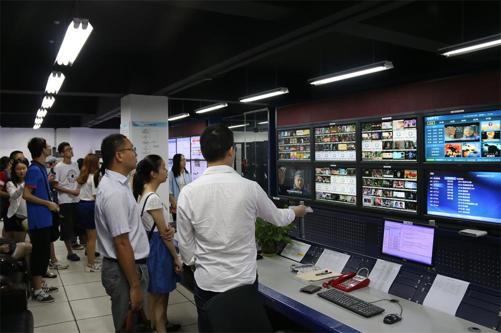 师生表示了热烈的欢迎,然后对海南广播电视总台及各个频道的发展进行详细讲解,让同学们对海南广播电视行业的发展有了初步的了解。随后在工作人员的引导下同学们参观了导播室、录音室、演播大厅以及电视台众多幕后工作者工作的地方,看到了幕后工作者的辛苦,看到了新闻背后的每个人的辛勤付出,看到了电视台的基础布局与设施。同学们在休息室看到《夜线》栏目工作人员疲惫的状态后不禁为众多幕后工作者的努力所触动。参观的时候恰逢新闻频道《整点新闻》节目直播,同学们在导播室全程观看了节目直播,对电视节目有了进一步的了解和认识。 随后在电视台工作人员的引导下,同学们去海南网络广播电视台进行参观。在海南网络广播电视台同学们参观了演播厅以及控制中心等场所,对网络广播电视有了进一步的认识,并了解了海南IPTV节目生产的流程。最终,在同学们的不舍中本次“走进企业”活动圆满落下了帷幕。 接轨社会,放眼未来。“走进企业”活动是户外直播